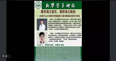 为充分利用校友资源,加强与历届校友间的交流联络,让同学们更加深入地了解到康复治疗学专业的性质和特色,了解康复行业发展的基本规律和发展趋势。中山大学新华学院第69讲学子讲坛于2020年11月25日晚19:30在腾讯会议(会议号:920485427)如期举行,本次讲坛邀请了2015级康复治疗学专业的优秀学子,他们分别是就职于深圳市儿童医院儿保科的洪培伟师兄和就职于中山大学孙逸仙医院呼吸内科的李镇丰师兄,而到场的嘉宾有康复系、听力系联合党总支副书记刘静丽老师、9428cn太阳集团古天乐辅导员吴亚丽、 9428cn太阳集团古天乐教务秘书陈颖老师、 蔡巧雯老师,以及2018、2019、2020级的全体学生。