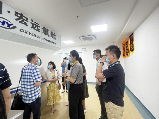座谈会后,在虞教授的带领下,谭杰文教授一行参观了广州慈惠医院的高压氧科、康复医学科、重症医学科。虞教授重点介绍了新型高压氧舱等设备,表示校院双方可充分发挥各自的资源优势,学生可到慈惠医院参加见习实习,老师可到医院进行临床学习交流,进一步深化医教融合,加强康复医学人才的协同培养。