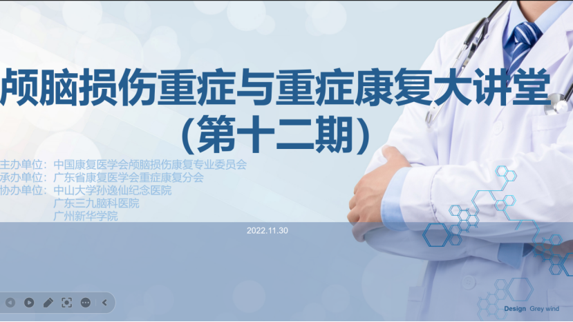 20221130日,第十二期“全国颅脑损伤重症与重症康复大讲堂”(以下简称“大讲堂”)在腾讯会议顺利。本期“大讲堂”由中国康复医学会颅脑损伤创伤康复专业委员会主办,广东省康复医学会重症康复协会承办,这个“大讲堂”已成品牌,之前每一期都办得非常成功。