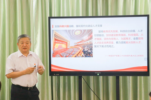 立足新时代新征程党的历史使命,王庭槐要求党员教师把党的创新理论运用到贯彻落实党的二十大提出的重大战略部署中去,在各个方面坚持以身作则、更要肩负起为学生终身发展奠基的责任,要着重培养拔尖创新人才。