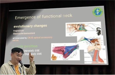 胡明一博士在分论坛中发表题为“颈部演化与特殊内脏神经支配”(Neck evolution and the special visceral nerve innervation)的演讲,该研究从比较解剖学的进化视角出发,结合基础医学、康复医学和运动科学,深入探讨人类行为和动作,尤其是不同神经类型之间的关系。这一研究不仅丰富了功能解剖学的理论基础,也为康复医学的实践提供了新的视角和方法。