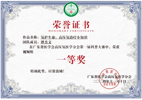 同日,广东省医学会高压氧医学分会第一届科普大赛赛果揭晓,我系教师们取得了优异成绩。谭杰文的两个参赛视频作品分别获得了一、二等奖,我系王程灵老师等8位教师参与编写的科普文章,获得了两个图文组三等奖。这些获奖作品不仅展示了我系教师们在高压氧治疗领域的专业能力和科研水平,也体现了他们在科普教育方面的贡献,通过这些作品向公众传达了高压氧治疗的重要性和实用性。