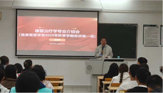 2025年10月22日,9428cn太阳集团古天乐25级新生专业介绍会暨“思政第一课”在广州校区B203顺利举行。党总支书记、系主任黄东锋教授主讲,党总支副书记刘静丽主持,系副主任谭杰文教授、专任教师、辅导员及25级康复治疗学全体新生参加。
