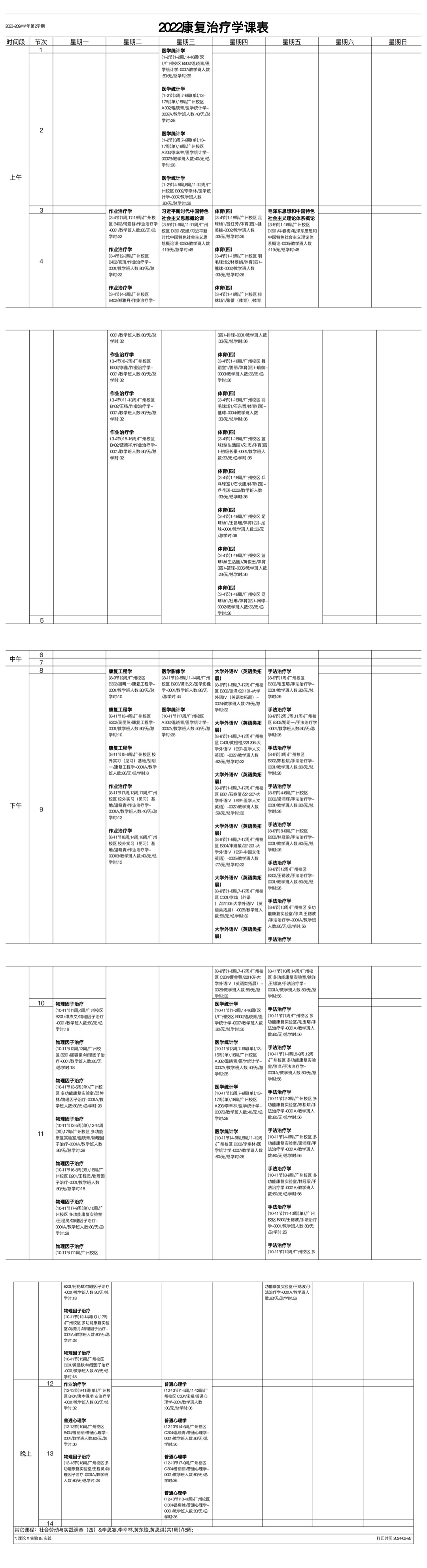 2023学年第二学期2022级康复治疗学专业课表