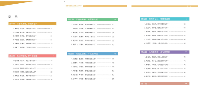 该书结合临床实践和校园生活特点涵盖了四季保健、饮食急症、运动创伤、实验安全、学习压力、居安思危等六个方面,标题朗朗上口,内容图文并茂,急救处理言简意赅。每一计都包含“小秘诀”和相关注意事项两部分,小秘诀中包含数条可以拿来即用的健康自救对策,供读者急救时快速翻阅;相关注意事项则是采用答疑解惑的方式对该问题进行补充或更加详尽的解释。细细品读感受到的是编者们对科普工作的满满诚意。