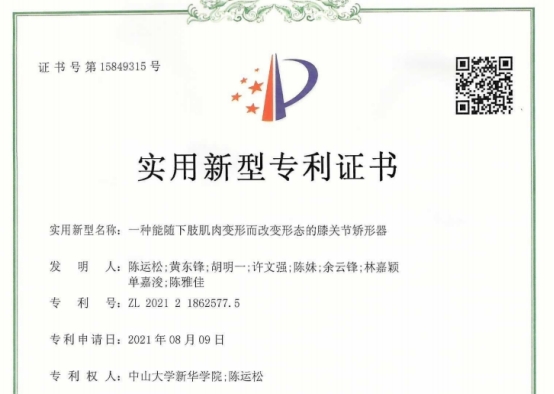 2018年,还是医学生的陈运松在导师指导下,带领团队申报了国家级大学生创新创业训练计划项目——“针对临床膝过伸现象而进行改良的康复辅具--膝过伸限制器”。在陈运松的坚持和母校的全力支持下,该项目于2021年,也就是陈运松毕业后一年,顺利结项。项目产出实用新型专利1项,为陈运松的创新之路奠定了坚实基础。