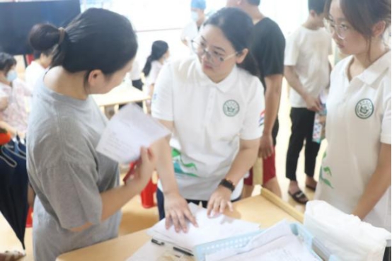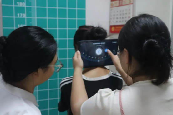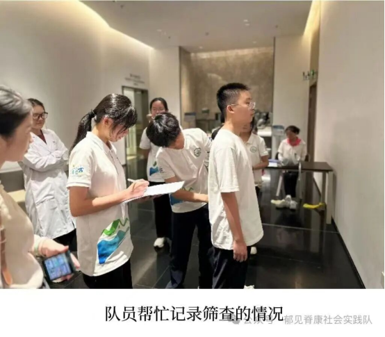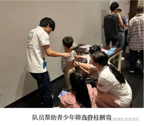“筛查比治疗更重要。”胡老师强调道。从7月23日起,团队在郁南县第二人民医院康复治疗部大厅开展公益筛查,吸引众多家长和孩子参与。队员们分工协作,有序进行体态检查、前屈测试和健康指导,对疑似案例详细记录并建议进一步检查。