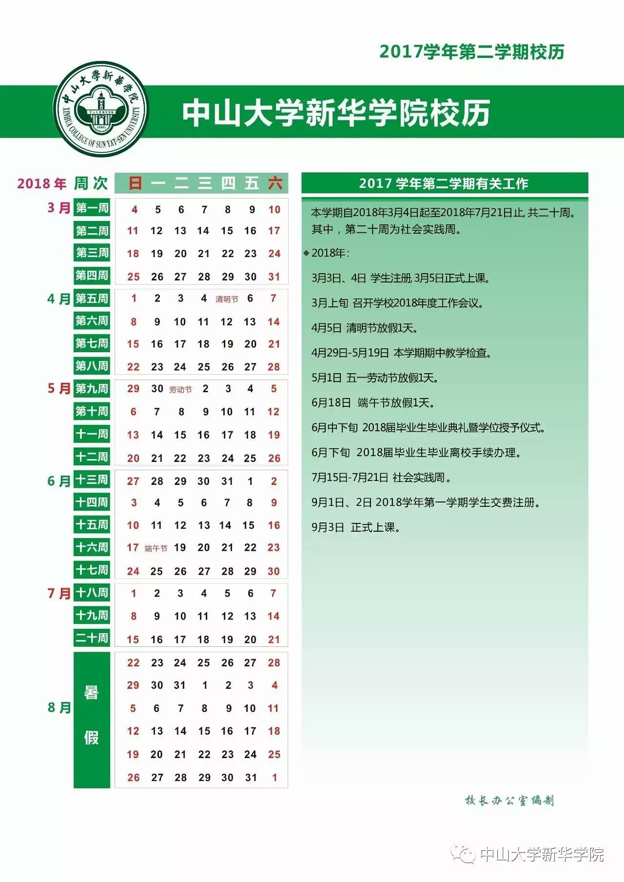 中山大学新华学院2017-2018学年校历
